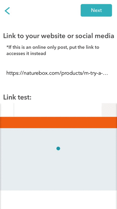 Put in the name of your product or business, followed by a weblink. With Sampy we let you visualize your link before submitting just to make sure everything is the way you expect.